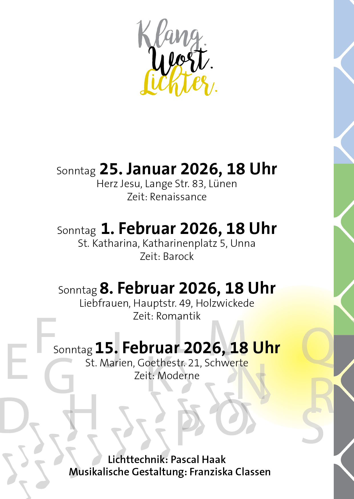 Dekanatskirchenmusikerin Franziska Classen und Dekanatsreferent André Hille freuen sich schon, an vier aufeinander folgenden Sonntagen, an vier verschiedenen Orten im Dekanat die (zum Teil eigens angesetzten) Abendmessen mitzugestalten. Lichttechniker Pascal Haak wird die Kirchen passend dazu stimmungsvoll beleuchten.
